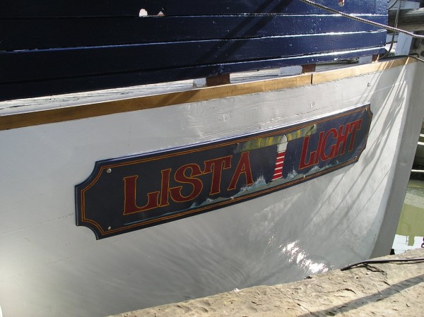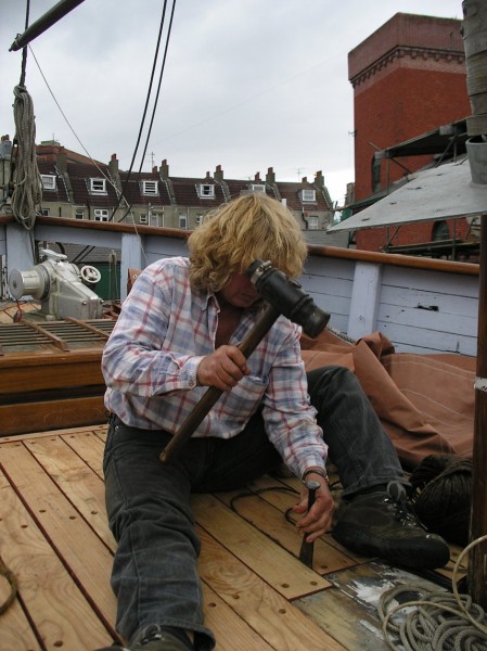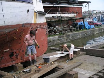 Before the voyage there was a considerable amount of work to be done to get Lista Light up to scratch. Lista is held together by big dowels of wood which go through the planks and into the frames inside, however 70 years on a lot had rotted and developed leaks. Plagued by lots of leaky rotted treenails on our previous voyage it was decided that it was priority to renew all treenails, which involved getting the boat out of the water and drilling and pegging some 1000 holes. Lista Light on the slipway in Bristol Docks ![]() First the treenails needed to be found under the paint ![]() Then drill out to 32mm ![]() Bash the peg in and use a wedge to open the end out ![]() A completed treenail, ready to be sawn flush, sanded and painted ![]() 2/3 of one side done ![]() But, a slight drilling error meant removal of the gearbox to get the engine exhaust box out to get a hole mended. ![]() Meanwhile, all sorts of other things going on - new radar system ![]() After the treenail holes were filled, lots of painting went on - 2 coats everywhere (above the waterline undercoat and topcoat, under the water a thick bitumen paint and anti-fouling paint to repel worms, barnacles and clingons. ![]() Paint job complete, about to return to the water. ![]() Click here to view an animation of the boat returning to the water down the slipway. Only one or two leaky holes (which were bodged with half a tube of sticky stuff) - not bad out of 1000 holes. ![]() The most important job - a touched up nameplate ![]() Weeks of perpetual sanding and varnishing - here the cockpit is getting the treatment ![]() ![]() ..and all the floorboards taken out, sanded and varnished ![]() Finishing touches to a new gaff ![]() The 4.5 tonnes of lead ballast ingots neatly stowed in the bottom of the boat, (together with a lot of sweat) ![]() Our posh new sails arrived - and fitted beautifully ![]() ![]() Rob playing with his box of tricks ![]() Then with only 3 weeks to go we decide that the foredeck really has to be replaced since it is rotten and leaks like a sieve ![]() A big hole …. ![]() And the slow process of putting it all back again ![]() Then Jay caulked for hours and Merryn poured pitch on top to seal the seams ![]() A last minute plank and a half replaced - here John is spileing the dimensions ![]() And then we were off ! Everything chucked on deck and covered with a tarpaulin in the mad scramble to make it away…. This page hit Count : 23300 This is the Lista Light Website, for the travels of the sailing boat Lista Light Click here for text-version of site |