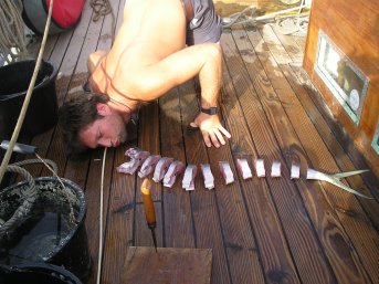 Cape Verde Islands to Antigua The beach activity continued in Cape Verde, and we made an excursion to San Pedro, where there was reported to be some surf. When we arrived, the beach was pleasant and deserted, but the waves were breaking very near the shore; however there was a good wind and the boys had fun being dragged along the beach by Rob’s kite. Bernardo, however, managed to catch a few waves perilously close to the rocks and showed Rob what he should be doing with his surfboard. ![]() After the usual entertainment of filling up with diesel and water, the haggling over fresh fruit and veg prices in the Cape Verde markets (helped no end by the Portuguese language capabilities of our new crew members), plus the lugging of all the provisions and ten cases of lager to the boat in the heat, much was prepared by the evening of Friday 19th for our departure the next day, and an attempt was made to finish the last of our Cape Verde money off on a meal and a few beers at the Club Nautico, where a band was playing. ![]() ![]() 20th November We paid off our ‘boat boy’ Orlando with some spare rope, some second hand clothes and a little cash for his doubtful services in ‘looking after our dingy while we were ashore’, picked up 50 rolls of fresh bread, stowed everything in it’s proper place, hauled the dingy aboard and weighed anchor at midday, saying goodbye to the Cape Verde islands, headed for Antigua some 2050 miles distant due west. By this time of year the north westerly trade winds should be fairly well established and reliable, so we hoped to have a good run most of the way there with the wind behind us. ![]() We made good progress that afternoon until the wind died was not enough to keep the sails filled as the boat rolled, so down they came and on went the engine that evening. We had started to blame the ship’s parrot (who is purported to be the source of the ship’s luck) for the continuous unfortunate wind that we were experiencing. ![]() 21st November Whilst at the helm overnight, Merryn was lucky enough to be hit in the back of the head by a flying fish which is a fairly scary event when half asleep – Noel came up from the chart table having heard several screams thinking Merryn had fallen overboard. The fishy theme to the day continued with Noel bagging a fairly large Dorado early morning, so it was fresh fish cooked in lemon and garlic for lunch. The other marine event of the day was passing a massive turtle, almost 2 metres long, which seemed just as interested in us as we were in it when we turned around for a look. ![]() 22nd November A big day – not only Jo’s birthday but Merryn and Rob’s 6 month wedding anniversary, and a full year since England won the rugby world cup final. Noel provided a celebratory drink of champagne and orange juice with breakfast, and Jo was given a variety of presents, some that Noel had hidden since Gibraltar, and some that he had made onboard, like this hair grip. ![]() Merryn cooked a special chocolate brownie cake which was enjoyed by all. ![]() We were very successful on the fishing front, catching a total of five Dorado, unfortunately they were all quite small so back they went. 23rd November The morning started with the biggest catch yet, reeled in by Cesar and Noel. ![]() Noel enjoyed himself for a while playing around with fishy bits. ![]() As it was so hot, we jumped into the sea to cool down and grabbed onto a rope to get pulled along behind. Cesar suddenly spotted a fin in the water which he thought looked like a shark, and there has never been such a quick exit by all from the water! Luckily the visitors were dolphins, and we had a lovely time swimming around with them for half an hour, Rob even managing to touch a couple of them by leaning off the bow of the boat under the bowsprit, and Cesar had a good go but wasn’t lucky. ![]() ![]() ![]() We were still motoring along since the wind had died the night after leaving the Cape Verdes, with nothing but very light wind from astern which was not enough to fill the sails properly as the boat rolled. The first of several inventive sail plans was put up – a bermudan triangular sail in place of the usual gaff mainsail, which flapped around less than the usual gaff mainsail, but was still not enough to turn the engine off. ![]() The Dorado caught earlier made a lovely Portuguese fish dish cooked by Bernardo. 24th November Still no wind to speak of, but a slight freshening from the north helped us along a little faster with the engine turned right down. The calm environment and smooth sea gave plenty of opportunity for relaxation and guitar practice. ![]() ![]() The fishing run of ten Dorado in a row was broken by Rob catching a fish we later identified as a Wahoo, although he was quite small (not exactly the 2 metres in length that they can grow up to) so he went back in. Whilst the decision was made to not keep him for dinner, Rob held onto his tail - watch the rivetingly exciting action in this small clip. Video – Wahoo fish flapping about (not very exciting) 25th November Despite a slight improvement during the night, there was nothing but the lightest of zephyrs in the morning, which encouraged the next sail configuration – a squaresail hoisted on a yard. Unfortunately it looked very ugly and makeshift (which it was) and didn’t do a thing. Here Jay is proudly standing in front of her creation. ![]() The lack of good sailing (or indeed anything else vaguely interesting to report for the day) allowed us to concentrate even more on our stomachs than usual – Spanish omelette and Portuguese fisherman’s bread for lunch followed by vegetable massala curry and home-made chapattis for dinner. ![]() Merryn dealt with a bag of chillies so that they would hang up and dry out, and stop going mouldy. ![]() 26th November At last, our prayers were answered and we were able to turn the engine off for the first time in five days and sail well all day, making very good prog