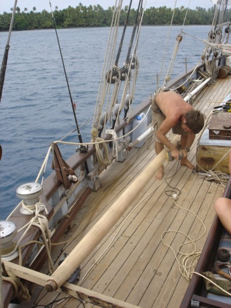 Chagos to Seychelles After we had all enjoyed a good nights sleep we decided that one of the biggest priorities was to get all our dirty washing done. So after Jack, Gareth and Martin had done a water run to the well on the next Island the washing machine was set up and the mammoth task got underway with Gareth as the officer in charge. ![]() ![]() Whilst the washing mission was underway Amiria got on with her sanding work on the main wheel, and Martin and Noel started caulking the deck near the coach house and Jack was up the shrouds taking advantage of the calm anchorage to put up another ratline. ![]() ![]() ![]() It was late afternoon before the washing was finished and we all settled down to enjoy a well earned sun downer. We all spent the next morning doing boat maintenance. After lunch however Jack, Martin and Gareth headed over to the larger of the two nearer Islands where they snorkelled the pass again from the other side seeing their first Chagos turtle and then spent the rest of the afternoon exploring the Island. ![]() Due to the exceedingly warm weather most people had taken to sleeping on deck, unfortunately the weather can be a little unreliable with it normally raining for two or three minutes most nights. We did however get a couple of good nights sleep under the stars. ![]() As we sailed in we spotted a wreck on the outer reef, so the next day Jack, Martin and Gareth set off again to have a look at the wreck. It was incredibly hard work wading through chest deep water for about a kilometre after swimming to the first island, across the pass to the second island and walking the length of the second island before heading off across the shallows. ![]() On the way back to the boat we decided to snorkel over the nearby wreck of a yacht that had sunk on the reef. In typical yachtie fashion it had been stripped of all stainless steel and anything that was salvageable but it still made a very interesting snorkel. ![]() It was three extremely tired crew men that boarded Lista that evening. They were greeted by the equally tired Noel and Amiria who had spent the day tying and replacing reef lines, and giving the mizzen gaff a good birthday. ![]() Everyone was busy for most of the next morning. About mid afternoon we all trooped ashore to have a barbeque lunch and a game of volleyball with a couple of people from the surrounding boats. It was a thoroughly enjoyable afternoon with some very close games. Jack had suffered several small cuts to his left foot and by the next morning it had swelled up and was painful enough to make walking difficult. After some deliberation Amiria bandaged it up with plenty of her mother's tea tree oil on the wound and gave strict orders that he should stay out of the water. ![]() Leaving Jack on the boat to rest his foot everyone headed off for an afternoon of spear fishing and snorkelling. It was a really beautiful snorkel having seen a turtle, a black tip reef shark, a lion fish and loads of other tropical fish and coral. Noel even managed to bag a good sized grouper with his spear gun. ![]() The next morning we raised the anchor and headed for Peros Bahnos, which is another Atoll in the Archipelago. As we motored out of the pass we had a double bonito hit on the lines. Martin was first to the rod and after a spirited struggle he hauled a good sized bonito onto the boat. ![]() After we had dealt with the fish and cleared the pass we had just enough wind to sail the thirty miles close hauled to Peros Bahnos. As the sea was so calm and we had the dinghy blown up on deck we decided to launch it and get some action photos of Lista Light sailing. Gareth and Martin got in the dinghy and circled around us a few times getting loads of great photos. ![]() ![]() We arrived at the Atoll of Peros Bahnos at about midday and anchored off Ile de Coin. Ile de Coin is one of the few of the islands that has evidence of civilization. The people of Chagos were moved away to Thailand in the late sixties, but they do return from time to time to visit the graves of their ancestors. All in all the Chagos Archipelago is a very isolated place only visited by yachties. ![]() Everyone trooped ashore to go exploring, except for Noel who stayed on the boat. There was rumoured to be some citrus trees on the Island, but after searching the length and breadth of the Island we were still fruitless. We did however get to see the ruins of the houses and church. ![]() The next morning we headed out to the pass where we anchored for about an hour, so Noel and Martin could do a dive. ![]() Once the dive was over and they were safely back on board we raised the anchor and headed out the pass and onto our course for the Seychelles. As we came onto our course we had the wind on our beam, so we put everything up except for a single reef in the mizzen to give us a good speed of five and a half knots. We were still pushing about half a knot of current though. We kept trucking along our course for the next three days, averaging about five knots, with the same sails. It was mid morning on the third day when we had our first fish hit of the passage which was a beautiful Dorado. It wasn't until the sixth day that we had a serious sail change to do. We dropped the main and jibed the mizzen and jib, only for the wind to change and force us to steer miles off of our line. So we jibed it back again and settled nicely back onto our course. The lack of sail changes did mean that we could get a lot of maintenance work done, or we kept busy by doing small projects as usual. ![]() The current has been getting stronger the closer we get to the Seychelles and we are now pushing nearly two knots. The wind did pickup on the eighth morning so we raised the main with a single reef in, and the staysail to compliment the number one jib and single reef mizzen that we already had up. This gave us a very pleasing seven knots through the water but we only averaged five knots over the ground. So the Perkins came on to 